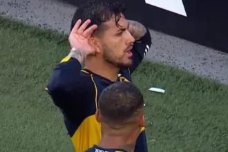 Tras anotarle a River, Paredes lanzó una seguidilla de festejos provocadores mirando hacia la tribuna local. Primero, agarró el escudo de Boca…