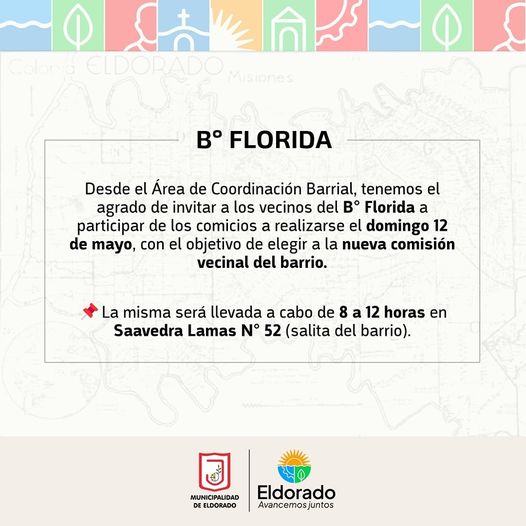 Desde el Área de Coordinación Barrial, tenemos el agrado de invitar a los vecinos del B° Florida a participar de los comicios a realizarse el domingo 12 de mayo, con el objetivo de elegir a la nueva comisión vecinal del barrio.