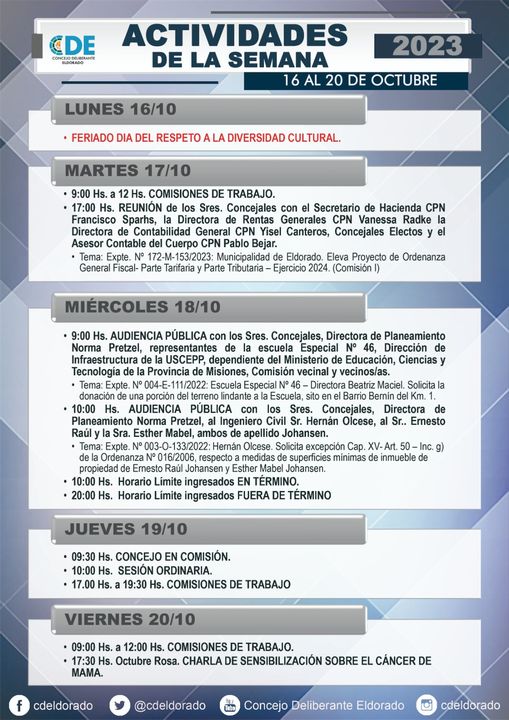 Informacion generalLocales Actividades programadas en el Concejo Deliberante Eldorado, del 16 al 20 de octubre. Última actualización: 2023/10/22 at 11:05 AM Dia uno Publicada 16 octubre, 2023 compartir compartir TAGGED: General Dia uno 16 octubre, 2023 Share this Article Facebook Twitter Email Copiar link Impresión Entradas recientes Clima para hoy, Sábado 18 de Octubre en Misiones Horóscopo de hoy, Sábado 18 de Octubre Eldorado | Detuvieron a un hombre que amenazó a su expareja con un cuchillo y provocó daños en la vivienda Franco Colapinto terminó 17° en la clasificación para la Sprint en el GP de Estados Unidos: así continúa el cronograma de este sábado Torneo Clausura | Boca recibe este sábado a Belgrano en La Bombonera en un partido cargado de emoción tras la muerte de Russo: hora, TV y formaciones