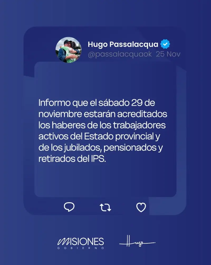 PASSALACQUA ANUNCIÓ QUE ESTE SÁBADO ESTARÁN ACREDITADOS LOS SALARIOS PARA TRABAJADORES ACTIVOS, JUBILADOS, PENSIONADOS Y RETIRADOS DE MISIONES