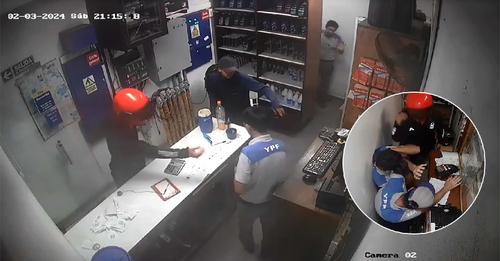 Toda la secuencia, que pasó de un amistoso saludo a momentos de tensión y miedo, fue captada por las cámaras de seguridad de la estación de servicio. En ese momento llegaron dos hombres a bordo de una motocicleta. Aparentemente, con la excusa de un problema mecánico en el vehículo, cuando uno de los playeros ingresó a local para traer una herramienta, los hombres lo siguieron detrás.