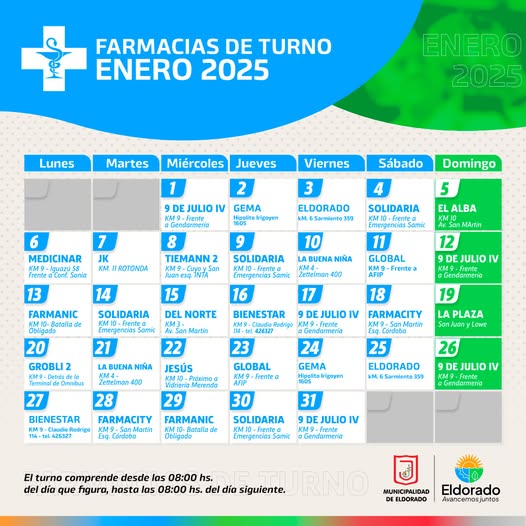 Localessalud Calendario de farmacias de turno durante el mes de enero de 2025 Última actualización: 2025/01/02 at 8:05 PM Dia uno Publicada 2 enero, 2025 compartir compartir TAGGED: Destacada Dia uno 2 enero, 2025 Share this Article Facebook Twitter Email Copiar link Impresión Entradas recientes Un homicida y un secuestrador, los dos internos que no regresaron de su salida transitoria en Eldorado Falta de plásticos paraliza la entrega de licencias de conducir: el problema que complica a los misioneros que cruzan la frontera Trump descolocó al Gobierno: ratificó que condiciona su apoyo a las elecciones legislativas y frustró el intento oficial de aclaración Rescate de menores en Garupá | “El grooming suele ser la puerta de entrada a otros delitos más graves”, sostuvo el procurador general Carlos Giménez Los cantos ancestrales resonarán en las Cataratas por el Día de la Diversidad Cultural