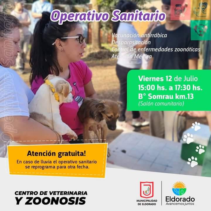 Continúan los operativos de atención del Centro de Veterinaria y Zoonosis de la Municipalidad de Eldorado. Con tareas de vacunación antirrábica, desparasitación, control de enfermedades zoonóticas y atención médica, esta semana el operativo se realizará en el barrio Somrau, kilómetro 13.