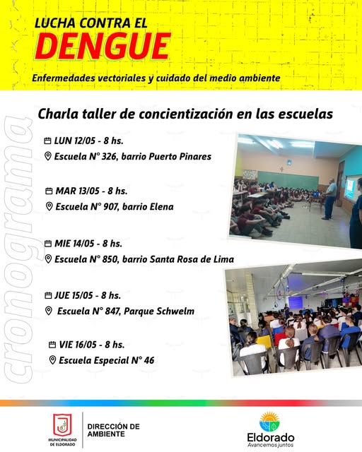 La Dirección de Ambiente, junto al equipo de Control de Vectores continua realizando charlas de concientización en las escuelas para que desde los más chicos puedan replcar las medidas preventivas para evitar la reproducción del mosquito transmisor de Dengue en sus casas.