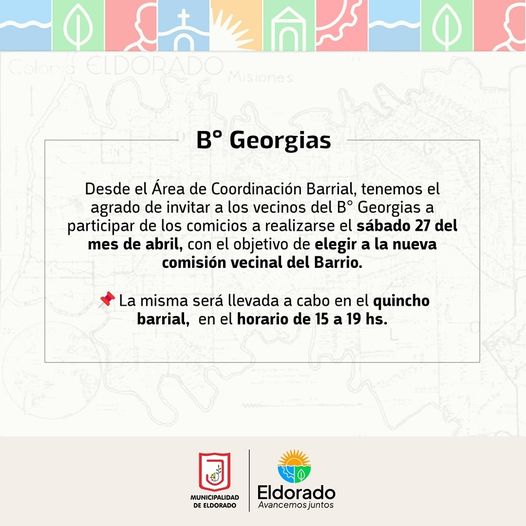 Desde el Área de Coordinación Barrial, tenemos el agrado de invitar a los vecinos del B° Georgias a participar de los comicios a realizarse el sábado 27 del mes de abril, con el objetivo de elegir a la nueva comisión vecinal del Barrio.