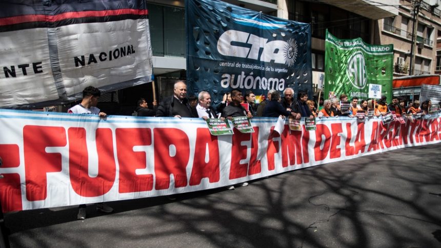 Diversas organizaciones ambientalistas, sindicales y sociales se movilizaron hoy frente a la oficina del Fondo Monetario Internacional (FMI) en la ciudad de Buenos Aires para reclamar que «se anulen las deudas financieras ilegítimas», como parte de una campaña desplegada en más de 20 países, bajo el nombre «Deuda x Clima».
