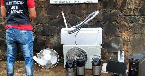 El primer procedimiento tuvo lugar, cerca de las 14 horas de hoy, cuando los efectivos de la Unidad Regional III, allanaron una vivienda ubicada en el barrio Antiguo de Eldorado, cuyo propietario, vecino de la Escuela 413, tenía oculto un aire acondicionado Philco, una cámara Canon, un ventilador, un par de parlantes y otros objetos robados de ese establecimiento. Los mismos fueron recuperados en la intervención.