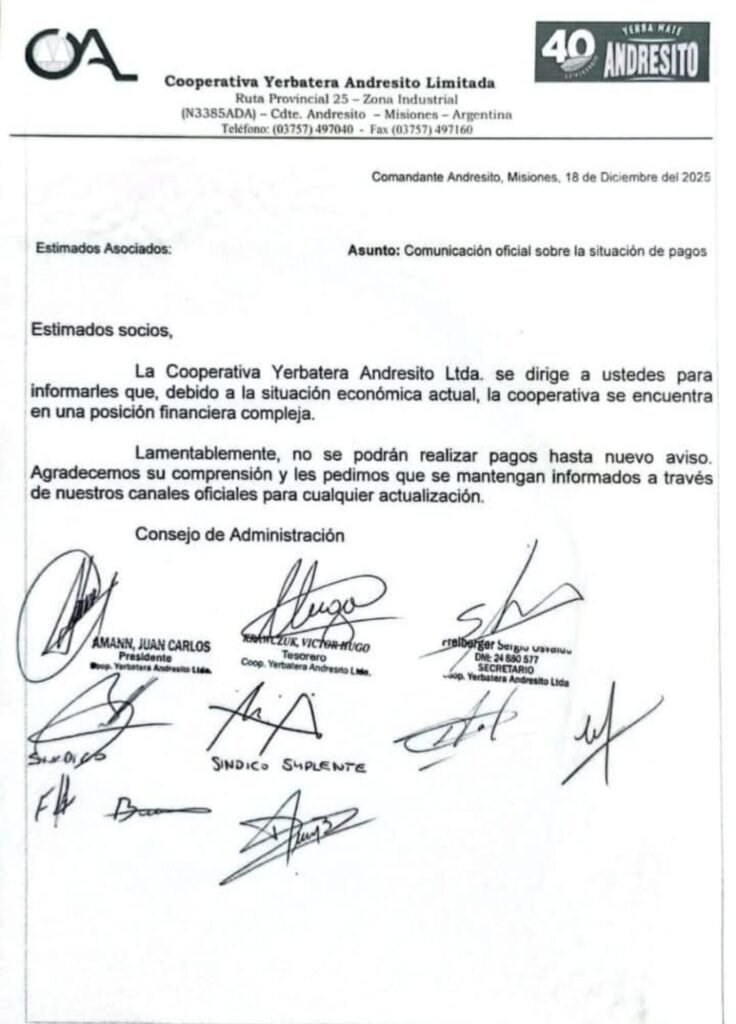 La Cooperativa Yerbatera Andresito Ltda., una de las entidades más emblemáticas del norte misionero y presidida por Juan Carlos Amann, dirigente identificado con el ideario libertario y defensor de la desregulación del mercado yerbatero impulsada por el gobierno nacional, declaró una crisis financiera y suspendió los pagos de contado a sus productores asociados, en un contexto económico y político marcado por la caída de precios y la pérdida de herramientas de regulación estatal, tras la eliminación de las facultades del INYM.