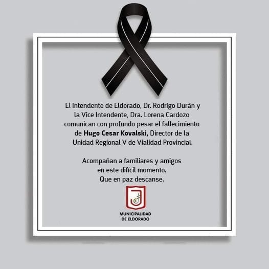 El Intendente de Eldorado, Dr. Rodrigo Durán y la Vice Intendente, Dra. Lorena Cardozo comunican con profundo pesar el fallecimiento de Hugo Cesar Kovalski, Director de la Unidad Regional V de Vialidad Provincial.