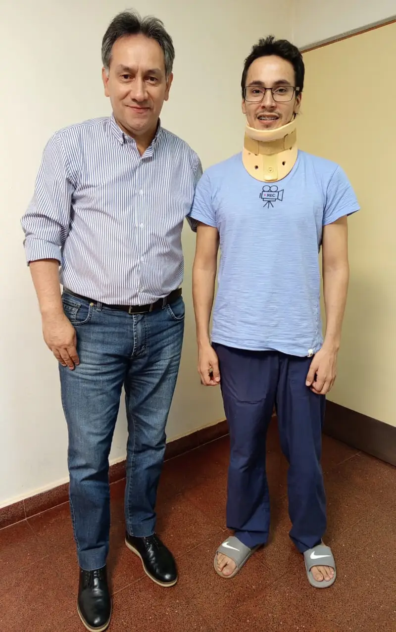 El joven Gustavo Báez, vecino de Montecarlo y sobreviviente de la tragedia del Arroyo Yazá, visitó al intendente para agradecer el acompañamiento y la asistencia recibida desde el municipio. Durante su testimonio, relató las graves lesiones sufridas: fracturas en las vértebras C3, C4 y C5, fémur y acetábulo, además de la cirugía raquimedular y los procedimientos médicos realizados tras la emergencia. Actualmente continúa con sesiones de kinesiología como parte de su recuperación.