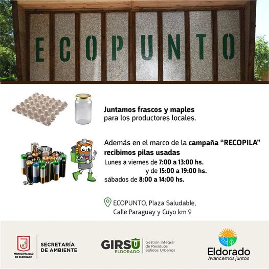 El Ecopunto Eldorado funciona de lunes a viernes de 7 a 13 horas y de 15 a 19 horas; y los sábados de 8 a 14 horas.