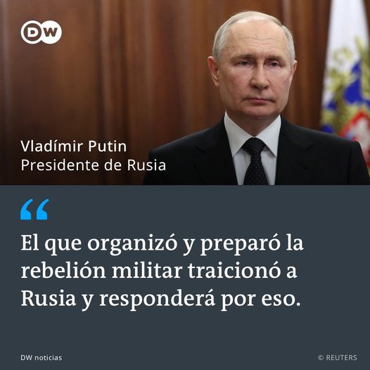 Según Putin, «los que intentaron organizar esta rebelión, (…) empujan al país a la anarquía y el fraticidio, a la derrota y a la capitulación». Y recalcó que «cualquier lucha intestina es una amenaza mortal para nuestro Estado». «Nuestras acciones para proteger la patria de esta amenaza serán firmes. Todos los que conscientemente tomaron el camino de la traición, los que prepararon la rebelión armada y tomó el camino del chantaje y los métodos terroristas, recibirán un castigo ineliduble, responderán antre la ley y ante el pueblo», aseguró.