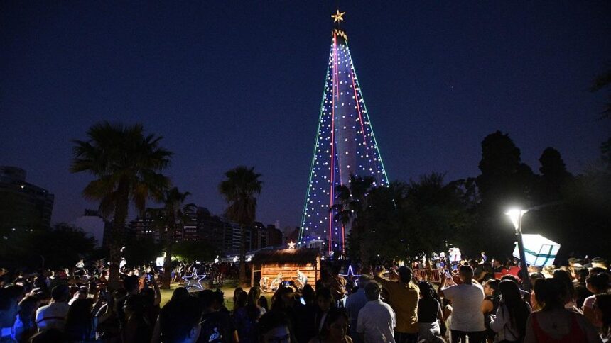 Se realizó este jueves por la noche la tradicional ceremonia del encendido del Árbol de Navidad que todos los años se arma sobre la estructura del Faro del Bicentenario y que tiene altura de 100 metros, ubicado en el predio del Parque Sarmiento, en la zona lindante con barrio Nueva Córdoba y Nores Martínez de la ciudad de Córdoba.