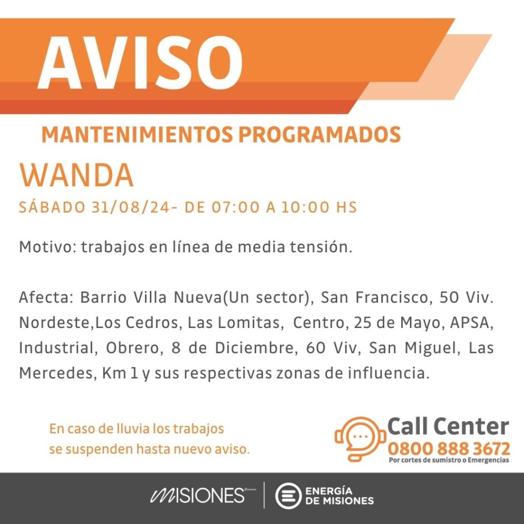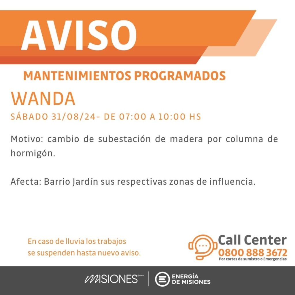 En Wanda, también el sábado 31 de agosto, se llevará a cabo el reemplazo de la subestación de madera por una columna de hormigón. Este trabajo implicará un corte de energía desde las 7:00 hasta las 10:00, y dejará sin energía eléctrica al barrio Jardín y sus alrededores.