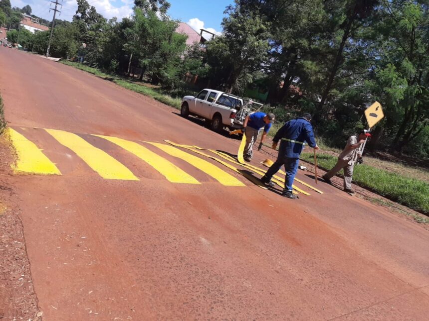 Este sábado, el equipo de Obras Públicas y de la Dirección de Tránsito, continuaron los trabajos de pintado de los lomos de burro y sendas peatonales.