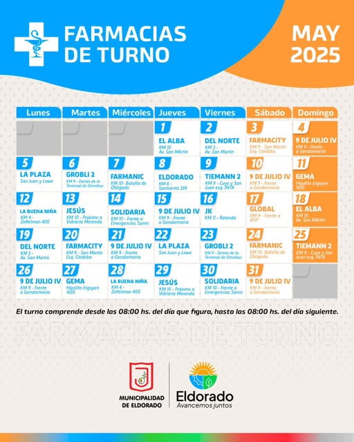 Localessalud Farmacias de turno para el mes de mayo! Última actualización: 2025/05/06 at 7:11 PM Dia uno Publicada 6 mayo, 2025 compartir compartir TAGGED: Recientes Dia uno 6 mayo, 2025 Share this Article Facebook Twitter Email Copiar link Impresión Entradas recientes Un homicida y un secuestrador, los dos internos que no regresaron de su salida transitoria en Eldorado Falta de plásticos paraliza la entrega de licencias de conducir: el problema que complica a los misioneros que cruzan la frontera Trump descolocó al Gobierno: ratificó que condiciona su apoyo a las elecciones legislativas y frustró el intento oficial de aclaración Rescate de menores en Garupá | “El grooming suele ser la puerta de entrada a otros delitos más graves”, sostuvo el procurador general Carlos Giménez Los cantos ancestrales resonarán en las Cataratas por el Día de la Diversidad Cultural