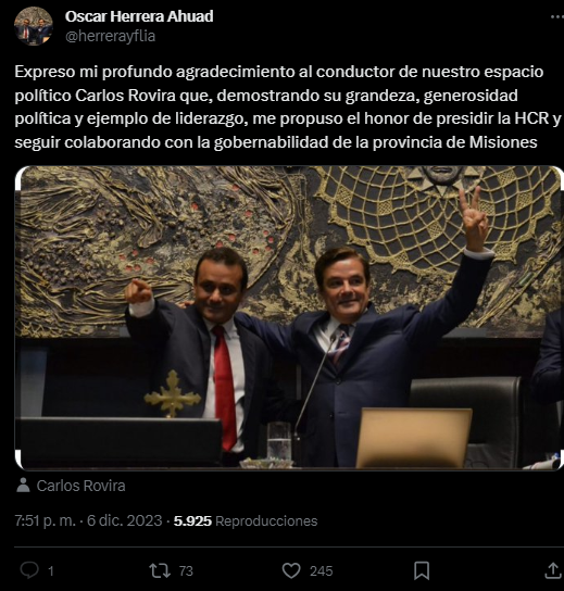 La respuesta no tardó en llegar por parte del actual gobernador Oscar Herrera Ahuad. «Expreso mi profundo agradecimiento al conductor de nuestro espacio político Carlos Rovira que, demostrando su grandeza, generosidad política y ejemplo de liderazgo, me propuso el honor de presidir la HCR y seguir colaborando con la gobernabilidad de la provincia de Misiones», escribió en su cuenta de X.