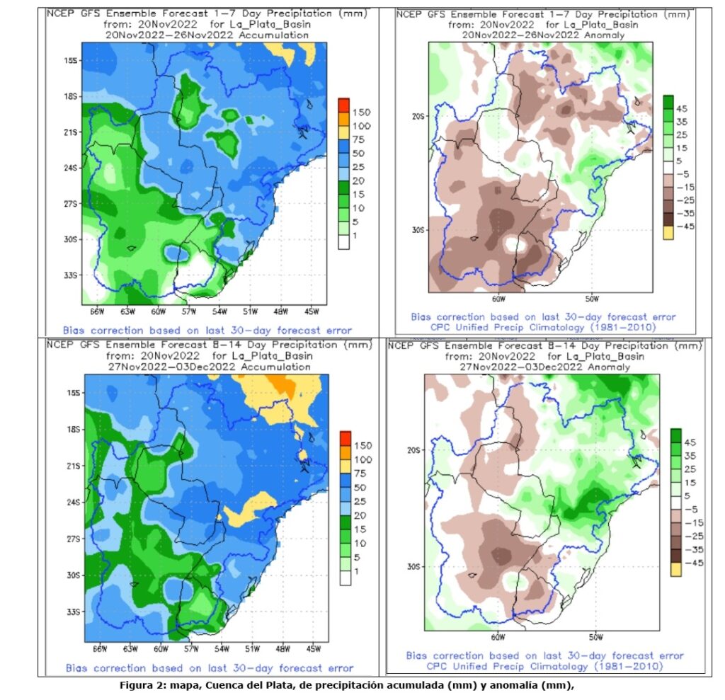 En la Figura 2 se presenta, para la Cuenca del Plata, el pronóstico de precipitación acumulada (mm) para las semanas desde el 20 al 26 de noviembre (semana 1), y desde el 27 de noviembre al 03 de diciembre (semana 2), como así también las anomalías (mm) para los períodos mencionados.