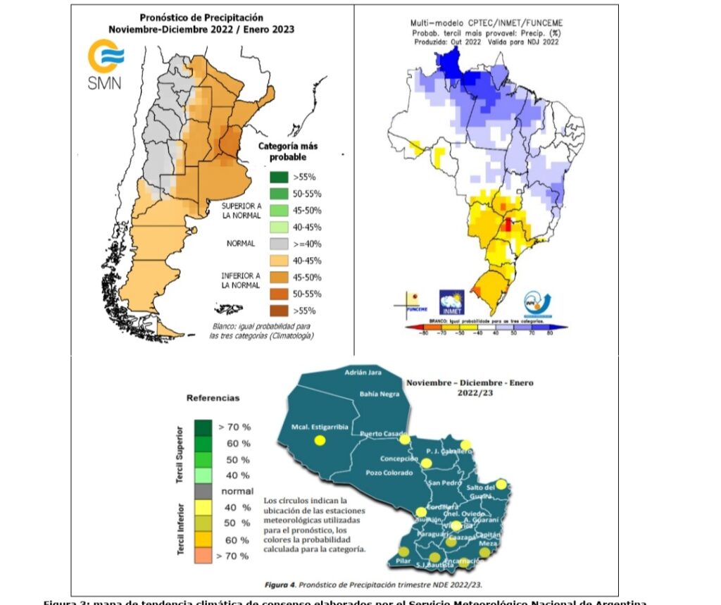 Figura 3: mapa de tendencia climática de consenso elaborados por el Servicio Meteorológico Nacional de Argentina (izquierda), CPTEC-INMET-FUNCEME de Brasil (derecha), DMH-DINAC de Paraguay (abajo) correspondientes a precipitaciones acumuladas en el trimestre noviembre-diciembre 2022 – enero 2023