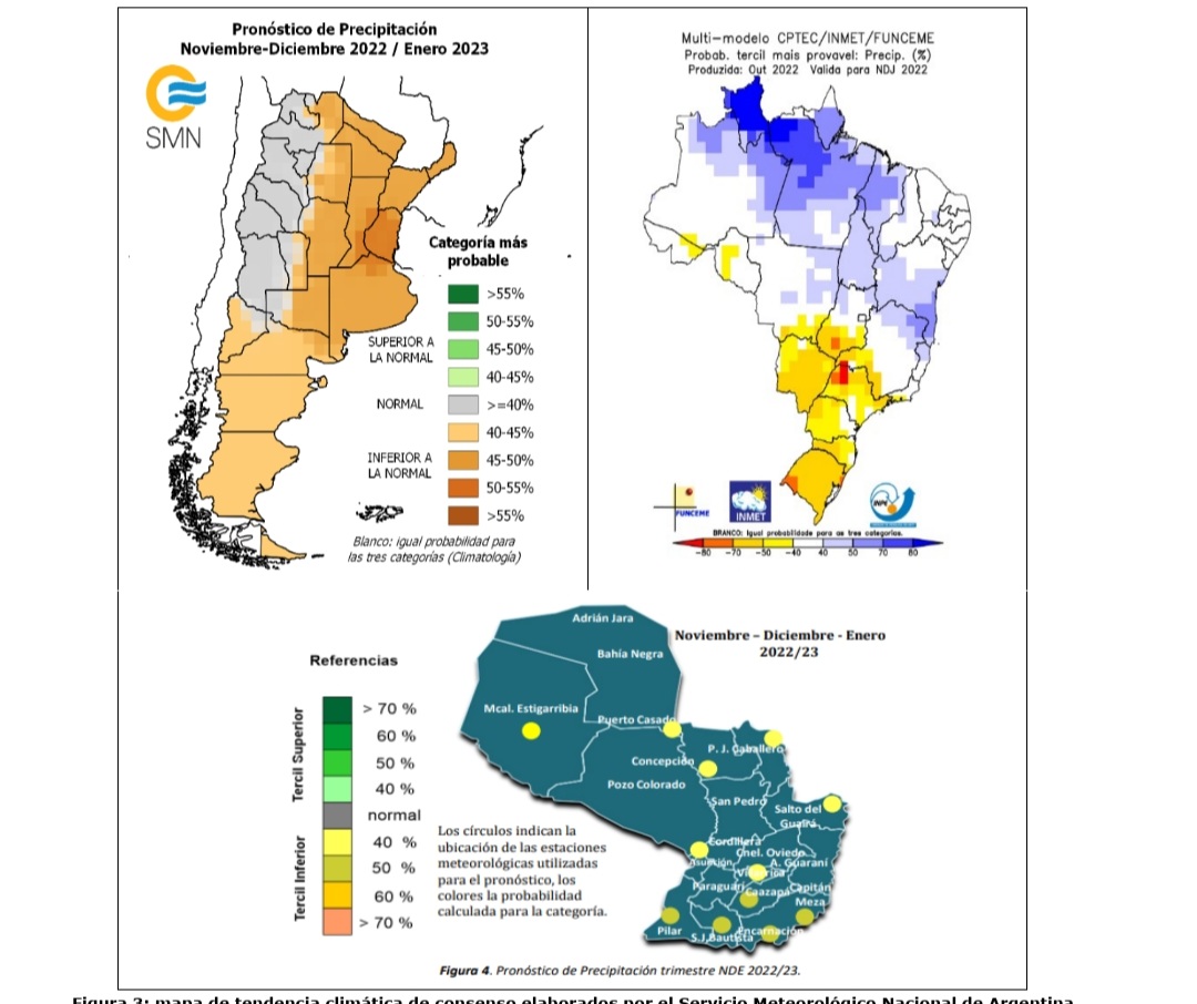 Figura 3: mapa de tendencia climática de consenso elaborados por el Servicio Meteorológico Nacional de Argentina (izquierda), CPTEC-INMET-FUNCEME de Brasil (derecha), DMH-DINAC de Paraguay (abajo) correspondientes a precipitaciones acumuladas en el trimestre noviembre-diciembre 2022 – enero 2023