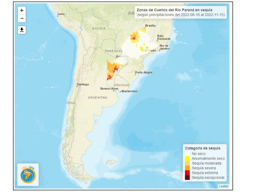 En la Figura 1 se observan las zonas de la cuenca del río Paraná en sequía según las precipitaciones de los últimos tres meses, desde el 16 de agosto al 15 de noviembre de 2022.