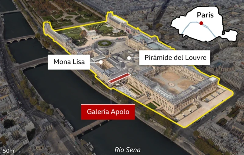 Cuatro ladrones armados irrumpieron el domingo por la mañana en el Museo del Louvre y robaron ocho joyas de gran valor histórico, entre ellas un collar de diamantes y esmeraldas que Napoleón Bonaparte obsequió a su esposa María Luisa. El asalto se concretó entre las 09:30 y las 09:40, pocos minutos después de la apertura al público. Los asaltantes utilizaron un camión con plataforma elevadora para ingresar por una ventana de la Galerie d’Apollon, rompieron vitrinas y huyeron en motocicletas tras amenazar a los guardias. El museo anunció que permanecería cerrado este lunes mientras continúan las investigaciones.