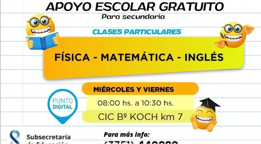 La Municipalidad de Eldorado a través de la Dirección de la Juventud, ofrece clases de apoyo gratuitas, en el Centro de apoyo Pedagógico y Tecnológico que funciona en el CIC del barrio Koch del kilómetro 7.