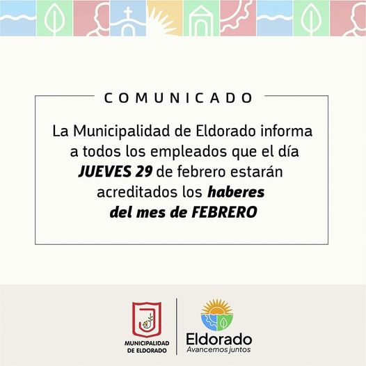 Informacion generalLocales La Municipalidad de Eldorado informa a todos los empleados que el día JUEVES 29 de febrero estarán acreditados los haberes del mes de FEBRERO. Última actualización: 2024/02/28 at 3:00 PM Dia uno Publicada 28 febrero, 2024 compartir compartir TAGGED: Últimas noticias Dia uno 28 febrero, 2024 Share this Article Facebook Twitter Email Copiar link Impresión Entradas recientes Tensión en San Vicente: cuatro adolescentes amenazaron con un arma tumbera a un joven Elecciones 2025 | Misiones aplicará el voto asistido para personas con discapacidad y así garantizará el ejercicio del derecho al voto El Puerto de Posadas concreta su octavo envío del año: 120 contenedores con productos misioneros y correntinos parten hacia países de América, Europa y Asia Puerto Rico | Una mujer en silla de ruedas resultó lesionada tras ser embestida por una camioneta El Museo del Louvre de París estimó en más de 100 millones de dólares el valor de las joyas robadas