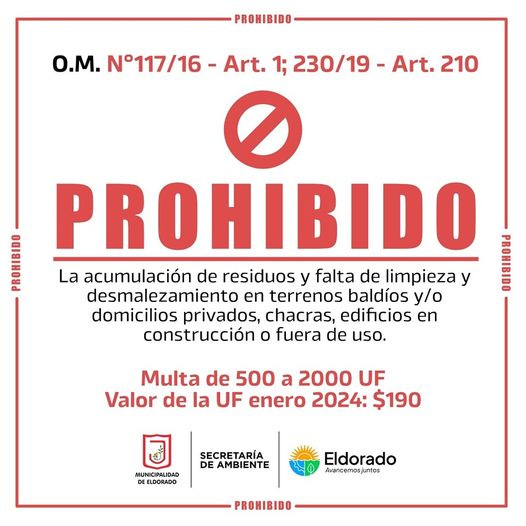La Secretaría de Ambiente de la Municipalidad de Eldorado recuerda la vigencia de la Ordenanza Municipal N°117/16 que establece la prohibición de la acumulación de residuos, la falta de limpieza y desmalezamiento en terrenos baldíos y/o domicilios privados, chacras y edificios en construcción o fuera de uso.