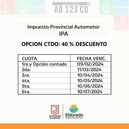 Informacion generalLocales La Municipalidad de Eldorado recuerda que está vigente el pago del IPA con 40% de descuento por pago contado. Última actualización: 2024/02/08 at 6:17 AM Dia uno Publicada 8 febrero, 2024 compartir compartir Vence este Viernes 9 de Febrero. TAGGED: General Dia uno 8 febrero, 2024 Share this Article Facebook Twitter Email Copiar link Impresión Entradas recientes Clima para hoy, Martes 21 de Octubre Horóscopo de hoy, Martes 21 de Octubre Pablo Laurta llegó a Córdoba para ser indagado por el doble femicidio: “Estoy en paz” Búsqueda desesperada y misterio: ¿qué se sabe sobre la pareja de jubilados desaparecida en Chubut? Avance prometedor: crean óvulos potencialmente fértiles a partir de células de piel humana
