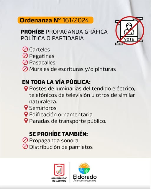 La municipalidad de Eldorado recuerda que se encuentra vigente en la ciudad la Ordenanza N° 161/2024 que prohíbe “la colocación de propaganda gráfica política o partidaria con fines electorales, mediante carteles, pegatinas, pasacalles, murales de escrituras y/o pinturas, en toda la vía pública, sean postes de luminarias del tendido eléctrico, telefónicos de televisión u otros de similar naturaleza, semáforos, edificación ornamentaria y paradas de transporte público».