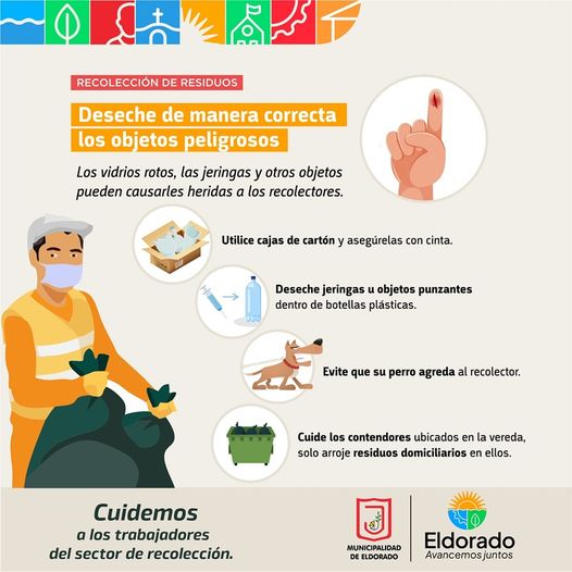 Elementos, jeringas, agujas, vidrios rotos y latas cortadas, y todo objeto punzante deben estar envueltos en cartones de leche, o dentro de botellas de plástico.