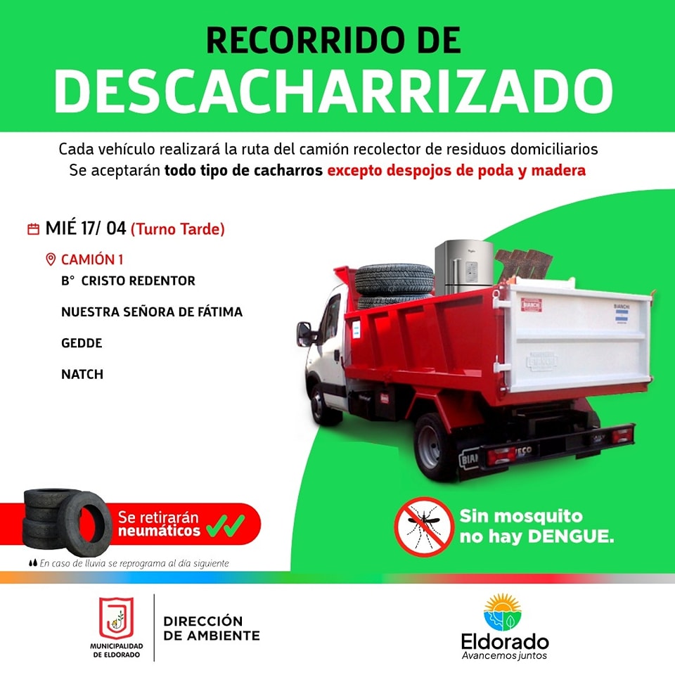 Puede ser una imagen de texto que dice "RECORRIDO DE DESCACHARRIZADO Cada vehículo realizará la ruta del camión recolector de residuos domiciliarios Se aceptarán todo tipo de cacharros despojos de poda y madera 曲 MIÉ 17/ 04 (Turno Tarde) อ CAMIÓN1 CRISTO REDENTOR NUESTRA SEÑORA DE FÁTIMA GEDDE NATCH Se retirarán neumáticos u caso liuna ይስ reprograme al dia siguiente Sin mosquito no hay DENGUE. MUNICIPALIDAD DEELDORADO DIRECCIÓN DE AMBIENTE Eldorado Avancemosjuntos"