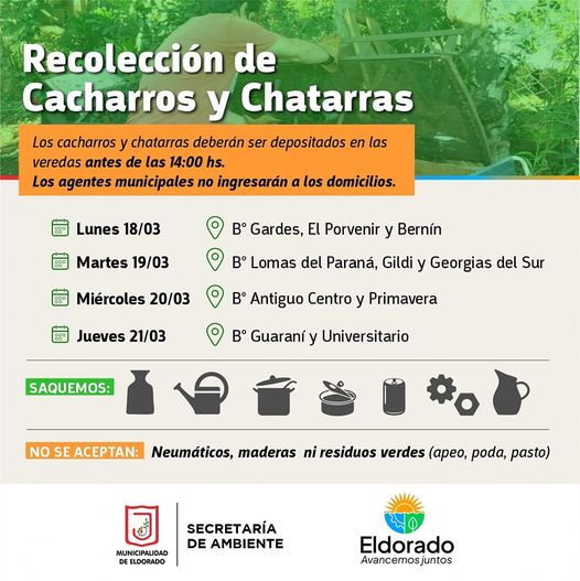 Los vecinos deberán disponer sus cacharros/chatarras en sus veredas previo a la recolección. (Los agentes municipales no retiraran de los domicilios los residuos).