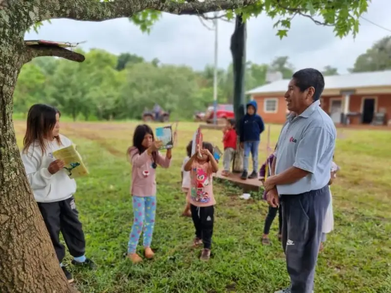 Patricio describió la dinámica: decoran o intervienen artísticamente las tapas de los libros y luego los cuelgan de tanzas en los árboles del predio escolar. “Salen de las aulas y, como si fueran abejitas, observan bajo los árboles, miran los dibujos, los textos. Después vuelven al aula, les preguntamos qué les interesó más y empiezan a contar, leer, intercambiar. Hablamos de la selva, del monte y del ambiente. Luego salimos todos juntos a plantar árboles nativos y frutales”, detalló. En muchas ocasiones, los niños se llevan los libros a sus casas para compartirlos con sus familias.