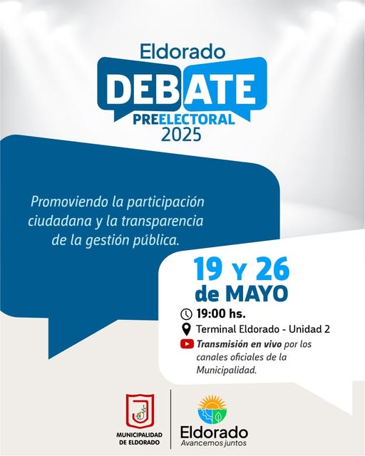 El debate será transmitido en vivo por el canal de Youtube oficial de la municipalidad de Eldorado.