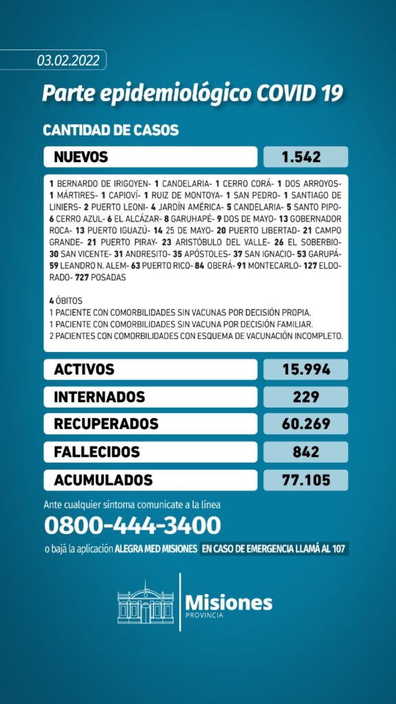 CORONAVIRUS(COVID-19)Provinciales Misiones emite parte epidemiológico Última actualización: 2022/02/03 at 5:36 PM Dia uno Publicada 3 febrero, 2022 compartir compartir TAGGED: Destacada Dia uno 3 febrero, 2022 Share this Article Facebook Twitter Email Copiar link Impresión Entradas recientes Horóscopo de hoy, jueves 16 de octubre: las predicciones para la salud, el amor y el dinero Clima hoy en Misiones: el pronóstico del tiempo para este jueves 16 octubre de 2025 La industria sigue sin repuntar: el uso de capacidad instalada en el país acumuló en agosto nueve meses por debajo del 60% Posadas | Se realizaron allanamientos en el barrio 508 Viviendas y detuvieron a tres jóvenes por robo y narcomenudeo Con las presencias de Hugo Passalacqua y Oscar Herrera Ahuad, “Cultura en Movimiento” inauguró su recorrido por las escuelas misioneras