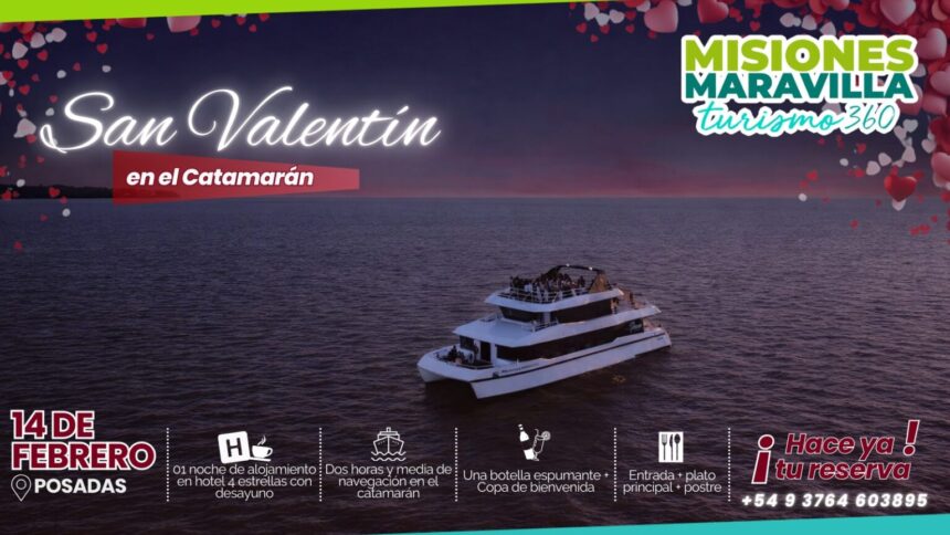Este San Valentín, disfruta de una propuesta pensada para parejas que buscan celebrar esta fecha con una experiencia diferente en Posadas: paseo nocturno en catamarán por el río Paraná, cena gourmet, música en vivo y alojamiento en hotel cuatro estrellas, todo en un solo paquete de Misiones Maravilla EVT.