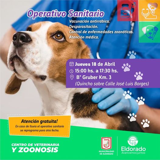 Informacion generalLocales Operativos de atención gratuita del Centro de Veterinaria y Zoonosis de la Municipalidad de Eldorado! Última actualización: 2024/04/15 at 1:29 PM Dia uno Publicada 15 abril, 2024 compartir compartir Seguimos visitando los barrios con tareas de vacunación antirrábica, desparasitación, control de enfermedades zoonóticas y atención médica. Jueves 18 de abril – B° Gruber – 15 a 17.30 hs. TAGGED: General Dia uno 15 abril, 2024 Share this Article Facebook Twitter Email Copiar link Impresión Entradas recientes Conmoción en un torneo de fútbol: un joven de 25 años se descompensó en la cancha y murió Bomba: Franco Colapinto podría correr con Alpine en Argentina durante el parate de la F1 en abril Con cinco partidos y tres grandes en acción, hoy continúa la fecha 11 del Torneo Apertura: horario, TV y formaciones Un dato inédito: la Selección Argentina llegará al Mundial 2026 sin enfrentar a equipos europeos Boca confirmó avances en el proyecto para ampliar La Bombonera