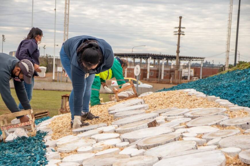 En el marco de la conmemoración del Día de la Bandera, personal de la Dirección de Embellecimiento Urbano materializó una enseña patria de 6 metros de largo y 1,5 de ancho, en el espacio verde localizado en la intersección de las avenidas Mitre y Costanera. Para ello se utilizaron 60 metros cúbicos de chips de colores celestes y 600 trozos de troncos.