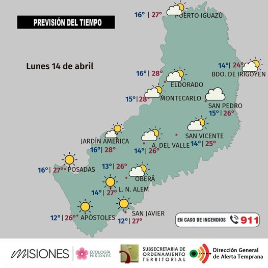Temperaturas: máxima en la provincia estimada en 28 °C para Montecarlo con 30 °C de sensación térmica, la mínima sería de 12 °C en Apóstoles.