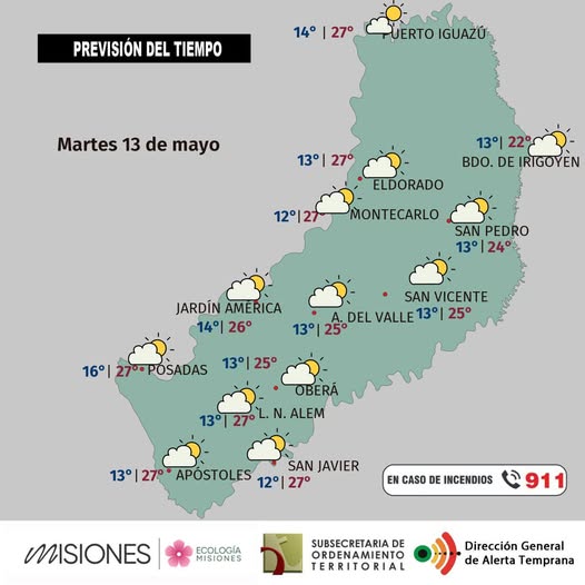 Temperaturas: máxima en la provincia estimada en 27 °C para Puerto Iguazú con 28 °C de sensación térmica, la mínima sería de 13 °C en San Javier.