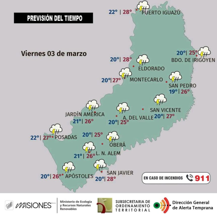 Temperaturas: máxima en la provincia estimada en 28 °C para Puerto Iguazú con 32 °C de sensación térmica; la mínima sería de 19 °C en San Pedro.
