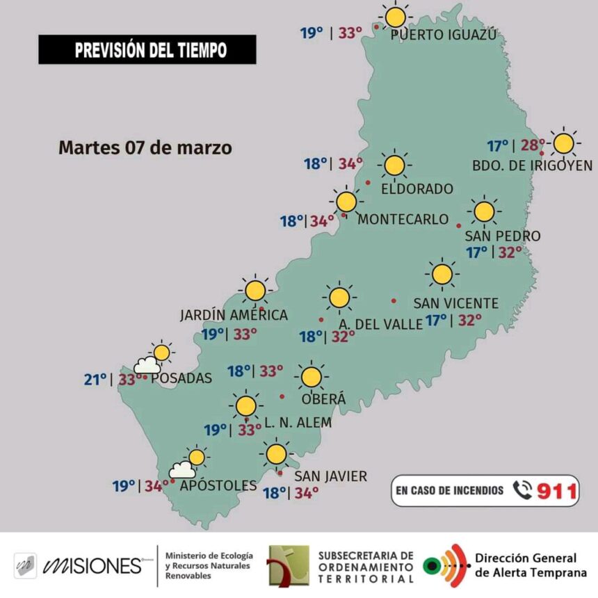 Temperaturas: máxima en la provincia estimada en 34 °C para Apóstoles con 35 °C de sensación térmica; la mínima sería de 17 °C en San Vicente.