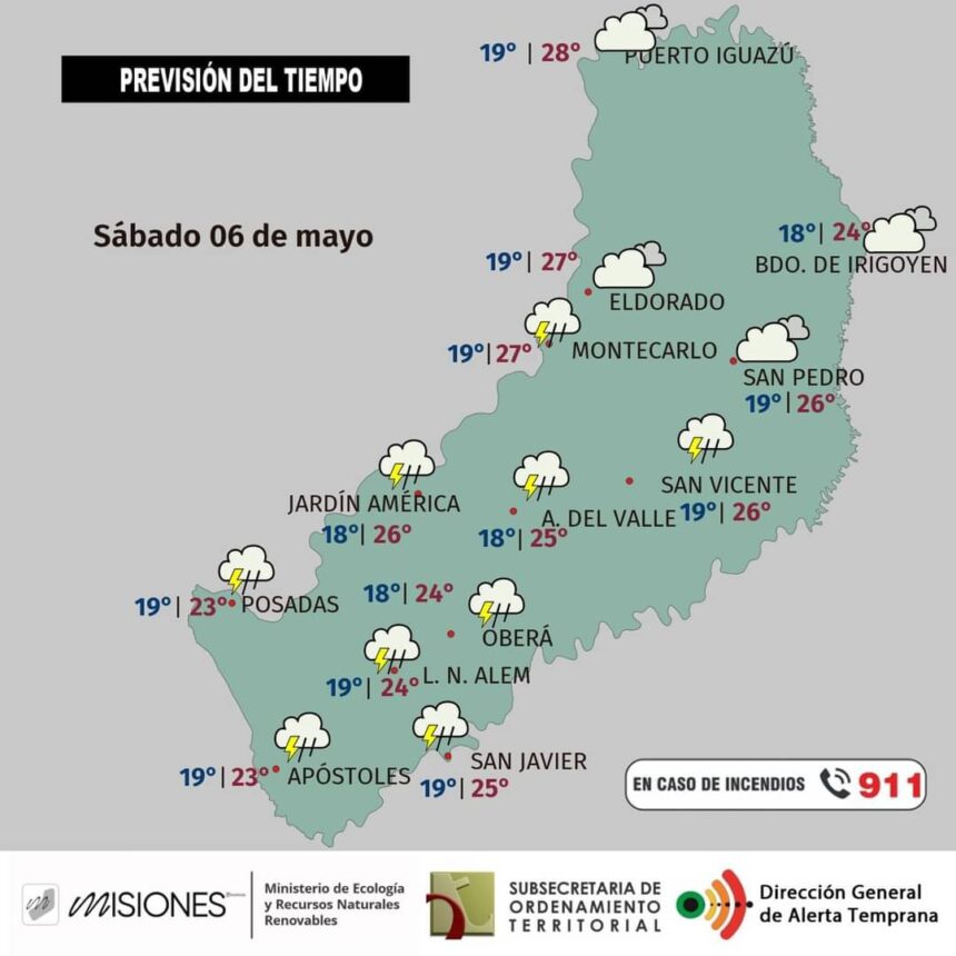 Temperaturas: máxima en la provincia estimada en 28 °C para Puerto Iguazú con 30 °C de sensación térmica; la mínima sería de 18 °C en Oberá.