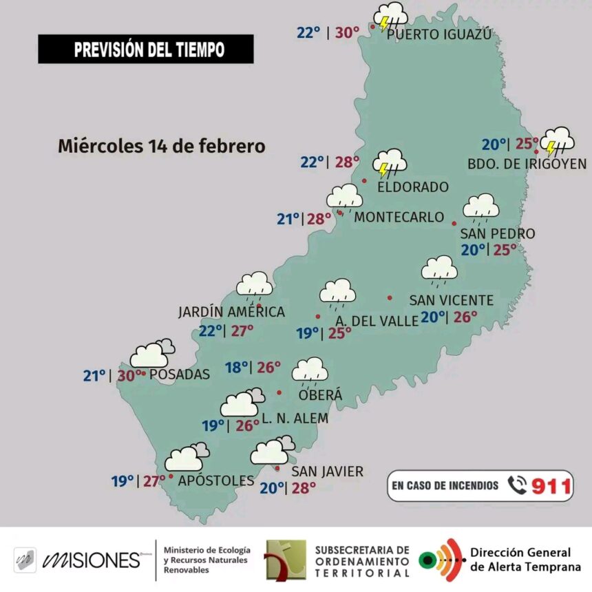 Temperaturas: máxima en la provincia estimada en 30 °C para Posadas con 35 °C de sensación térmica; la mínima sería de 19 °C en San Pedro.