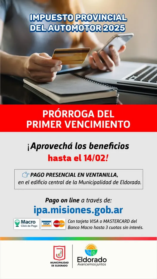 La Municipalidad de Eldorado informa que se prorrogó el primer vencimiento del Impuesto Provincial Automotor (IPA) al viernes 14 de febrero.