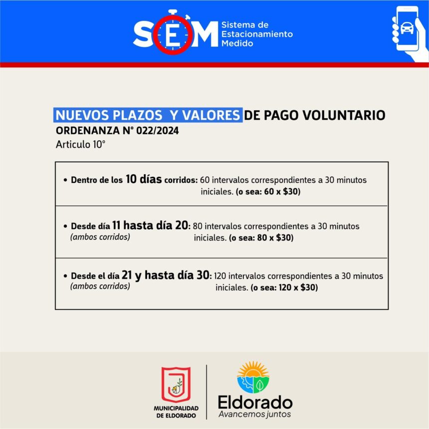 La Municipalidad de Eldorado informa el nuevo cuadro tarifario del Sistema de Estacionamiento Medido.