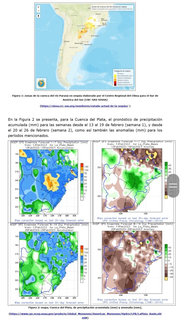 En la Figura 1 se observan las zonas de la cuenca del río Paraná en sequía según las precipitaciones de los últimos tres meses, desde el 06 de noviembre 2022 al 05 de febrero 2023.