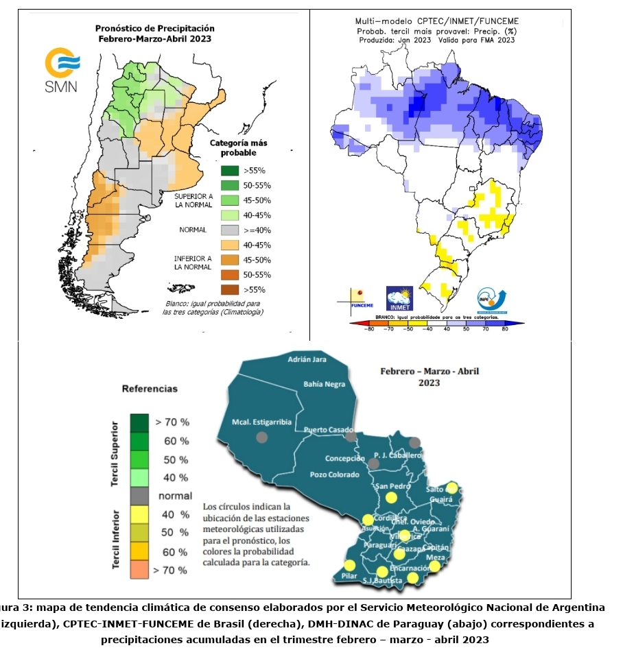 El Servicio Meteorológico Nacional (SMN-AR) para el trimestre febrero-marzo-abril 2023, prevé probabilidad de ocurrencia de precipitación normal o inferior a la normal para la porción argentina de la cuenca del Paraná de aporte a Yacyretá.